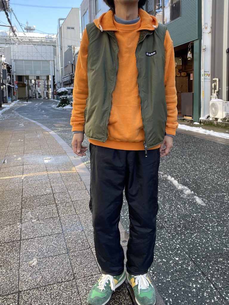 因みに今日のスタイルですが、昨日から愛知県一宮市は結構な雪が降っていて、朝起きたら10センチくらい、雪が積もっていたので今日はポストオーバーオールズの中綿入りのパンツを履き、ダブルワークスのスウェットパーカー、その下にムーンキャッスルのモックネックのセーターで個人的に好きなライトブルーをポイントにし、その上にパッファローシステムズのリバーシブルビレイベスト、足元は雪だったので、ダナーを履きましたが、アウトドア感が強くなるので私物のニューバランスのM990のグリーンに履き替えました笑