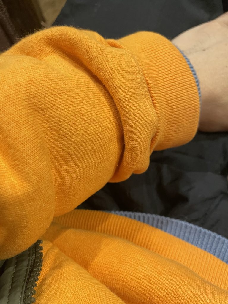 定番のヘザーグレーやネイビーも好きですが、こう言う変わった?カラーのオレンジも持っているとファッションも楽しめるかと思います。