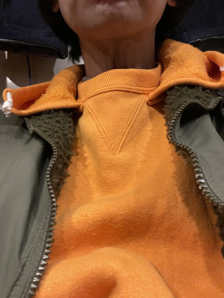 いつ頃から好きになったのかは覚えていませんが、このオレンジのスウェットのカラーが好きなんですよね〜。