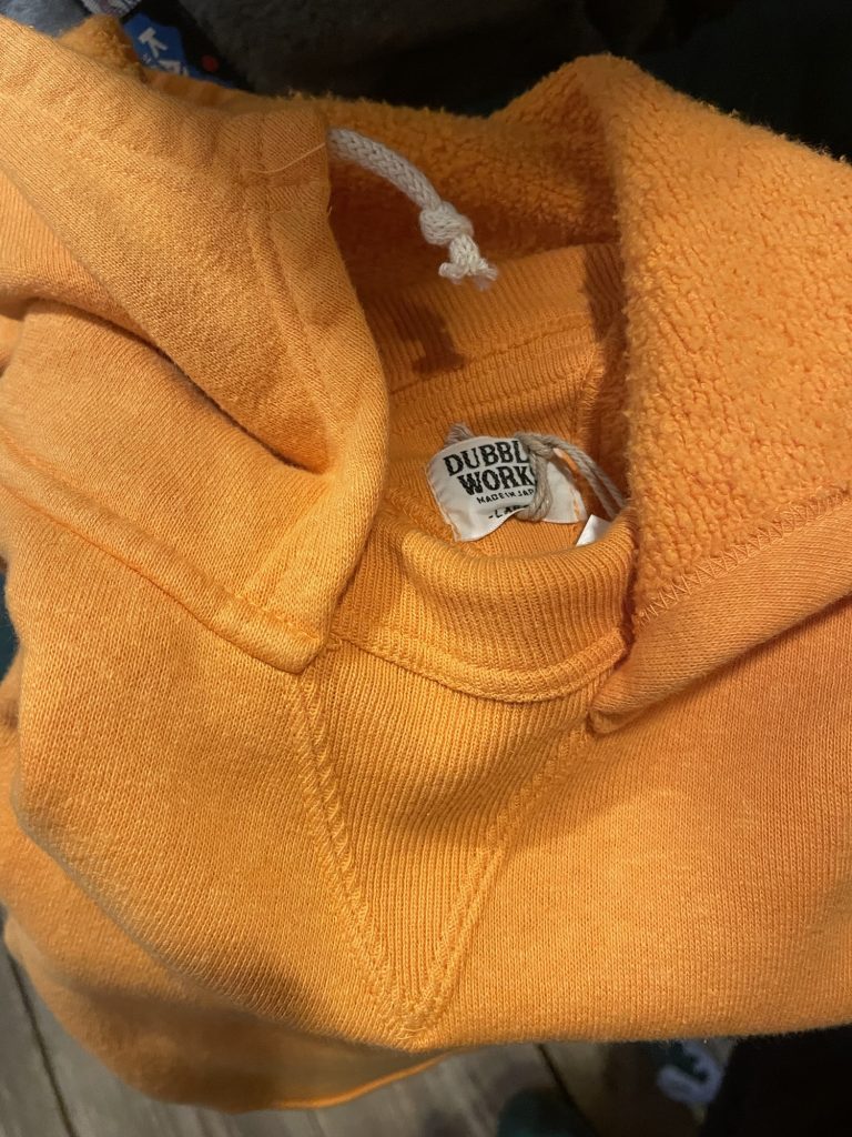 吊り編み生地を使用しモノづくりがしっかりしているダブルワークスのオレンジのスウェットパーカーは他では見かけないのでお好きな方は是非オススメします!