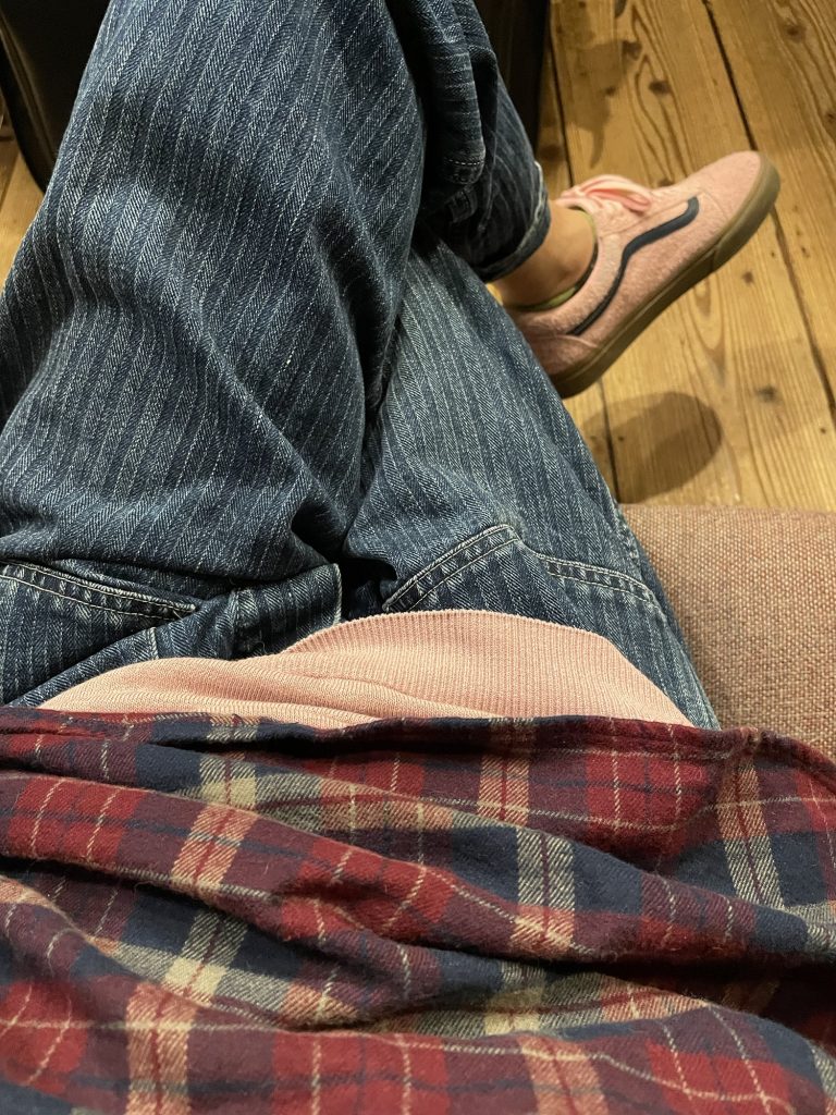 パンツは昨年の秋に購入したポストオーバーオールズのアーミーパンツで素材はヘリンボーンのデニム生地を縦横の糸をインディゴで染めたダブルインディゴカラーとなっていて、深みのあるカラーなのでディープウォッシュ加工が施されていて程よく色落ちしていますが、僕自身洗い込んでいるので大分色が抜けてヘリンボーンが浮き出ています。