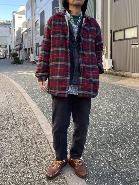 アウターとパンツが暗めなので、インナーに柄シャツを着て、その下のニットはグリーンにしているので、暗くなりがちな冬のスタイルのポイントになり当店らしいスタイルに仕上がっていると思います。