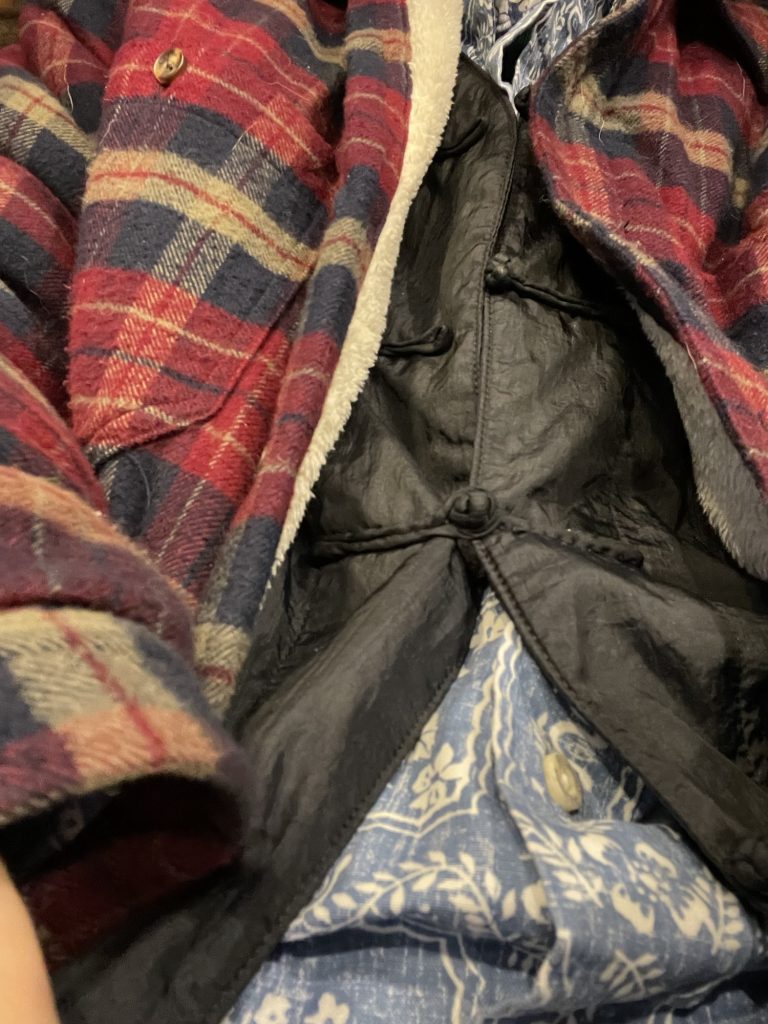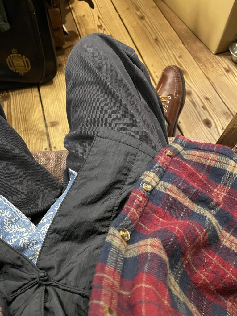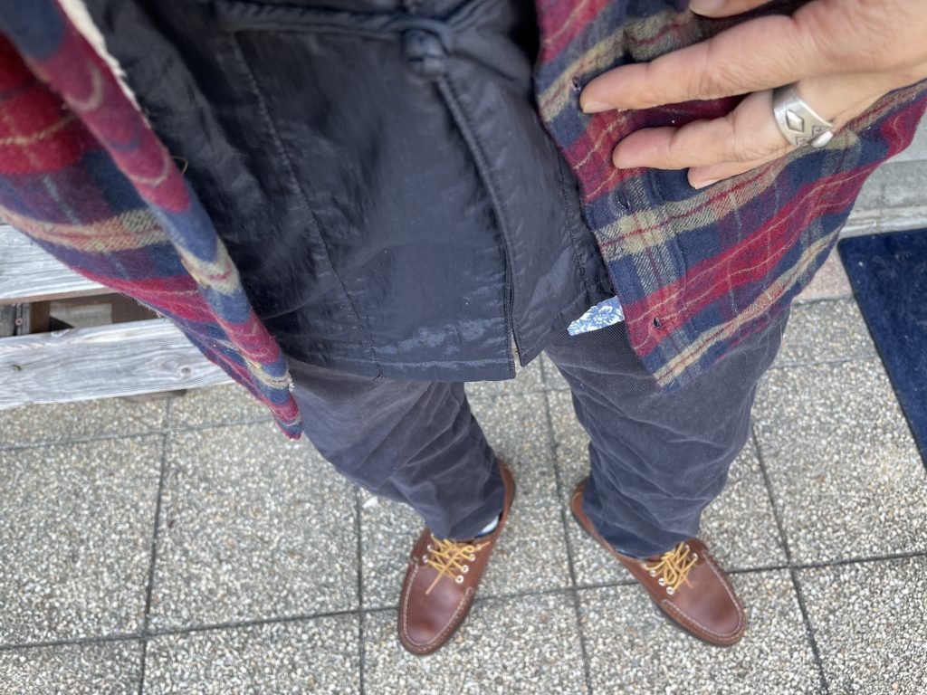 風が強いのでお気に入りのフランネルフリースラインドシャツジャケットの下に以前購入した、私物のポストオーバーオールズのポストシノワDVのシンサレートの中綿入りが入ったジャケットを着ています。