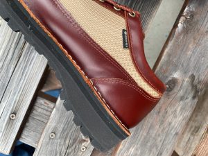 カラーは、ダナーライトお馴染みのブラウンとカーキのツートンカラーとなっていますが、今回のRバージョンは、防水性のあるのフルグレインレザーで、赤みのあるブラウンの表革にやや明るめのカーキ(ベージュ)のナイロン素材となっており、味わいのあるカラーとなっています。