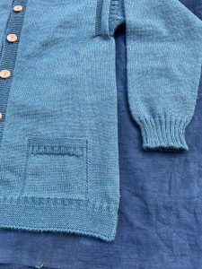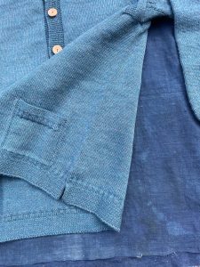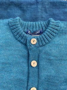 その他ポイントでもある、前開きのボタンはナチュラルカラーのウッドボタンで、ネックはクルーネックでリブ編みとなっています。また、ブリティッシュウールを度詰めした生地は、タフな作業でも対応できる仕様です。