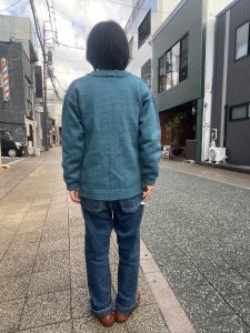 シルエットは、肩が落ちるドロップショルダーで、元々熱を逃がさないために、身幅はタイトフィットですが、こちらのガンジーセーターは、タウンユース向けにやや広めとなっています。
