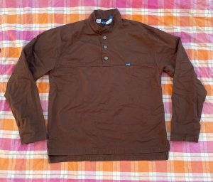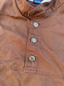 デザインですが、基本的に半袖と同じデザインで、長袖のプルオーバータイプに、襟がマンダリンカラー(マオカラー)で、前立てにロゴが入った真鍮のシャンクボタンとなっており、クラシックで普遍的なデザインとなっています。