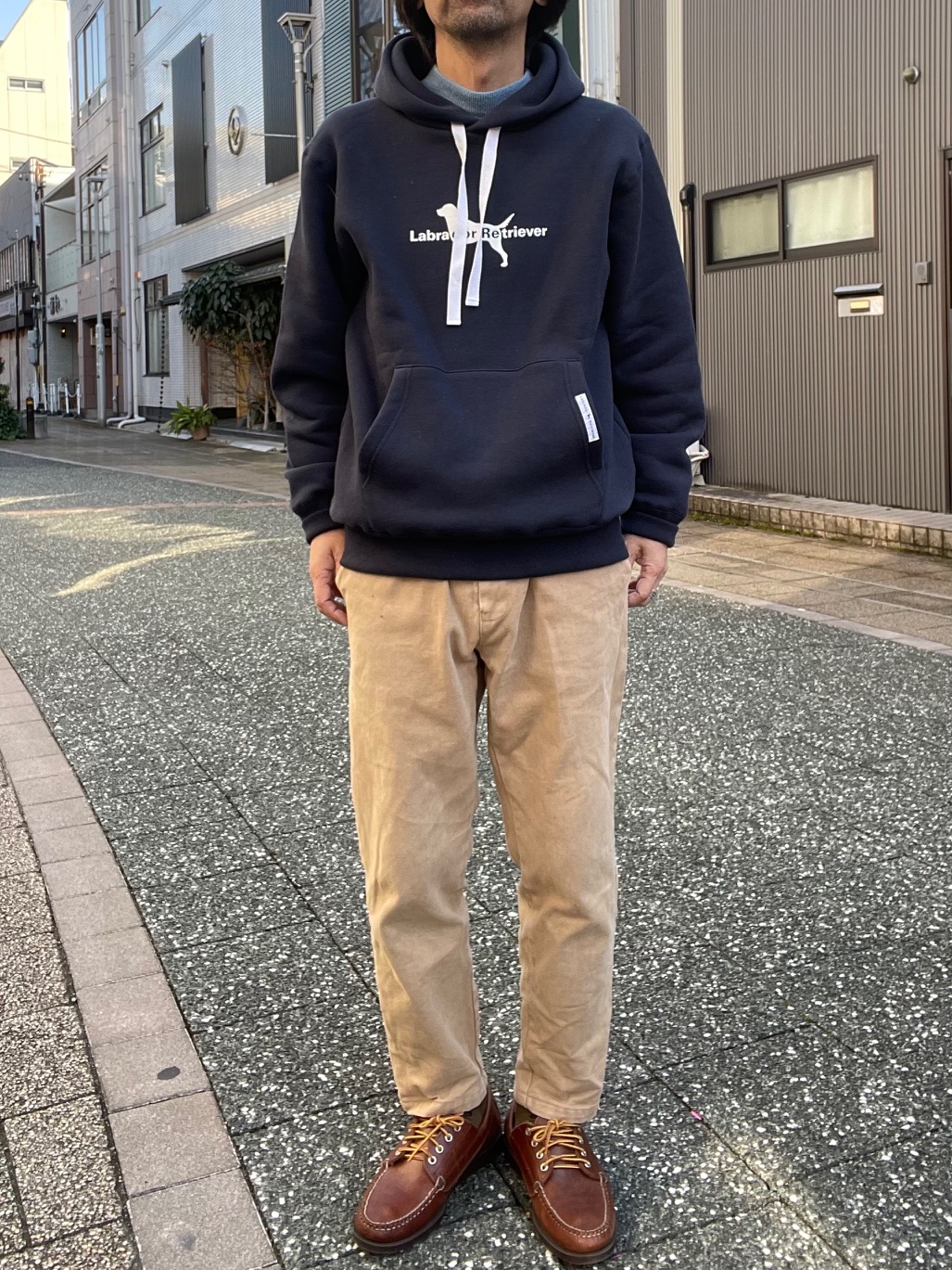約20オンス程のヘヴィーウェイトの生地ではありますが、ラブラドールオリジナルのふわっとした柔らかな素材感はそのままで、裏起毛コットン100%のボディに、フロントにポケット、フードが付き、