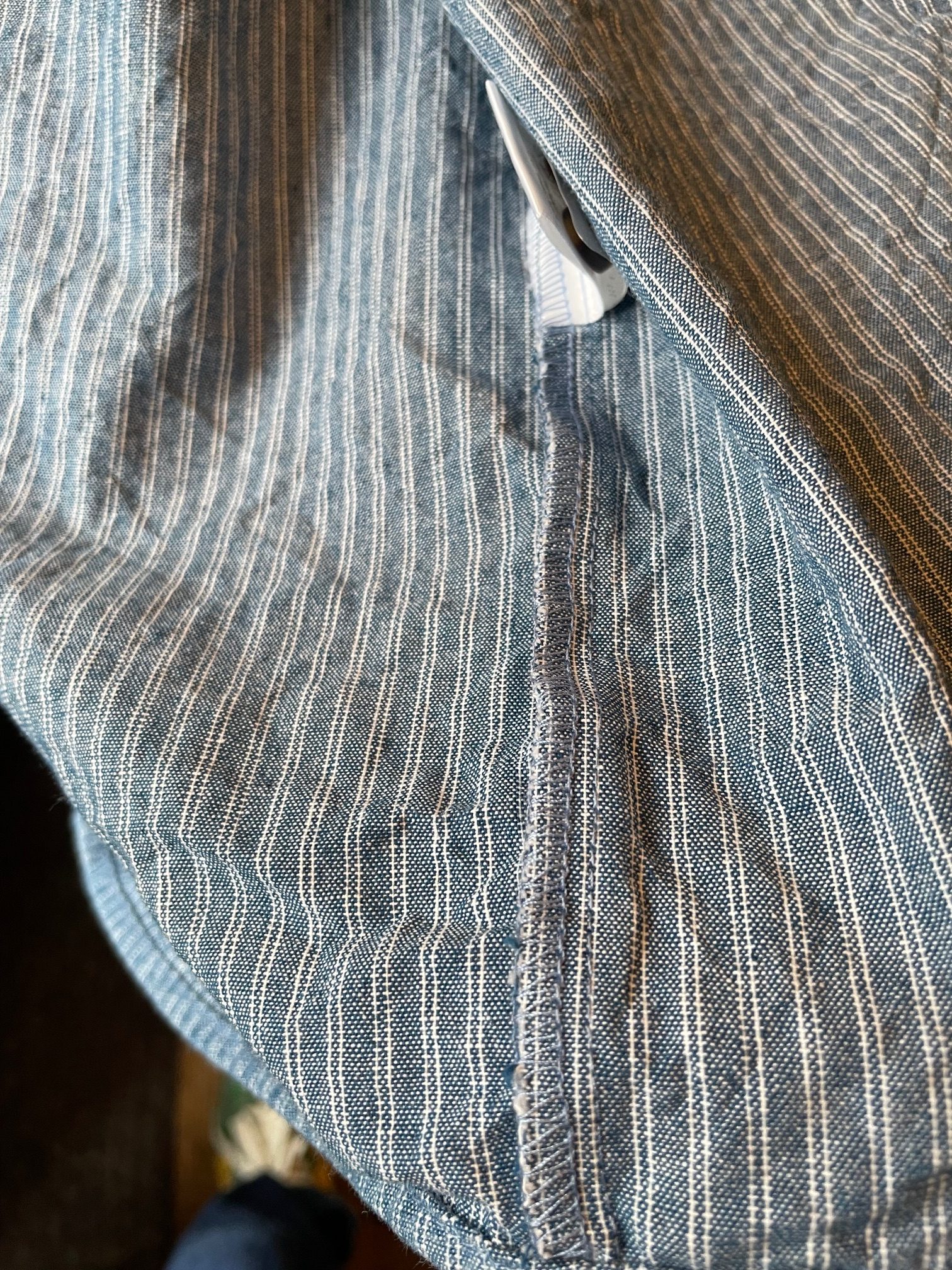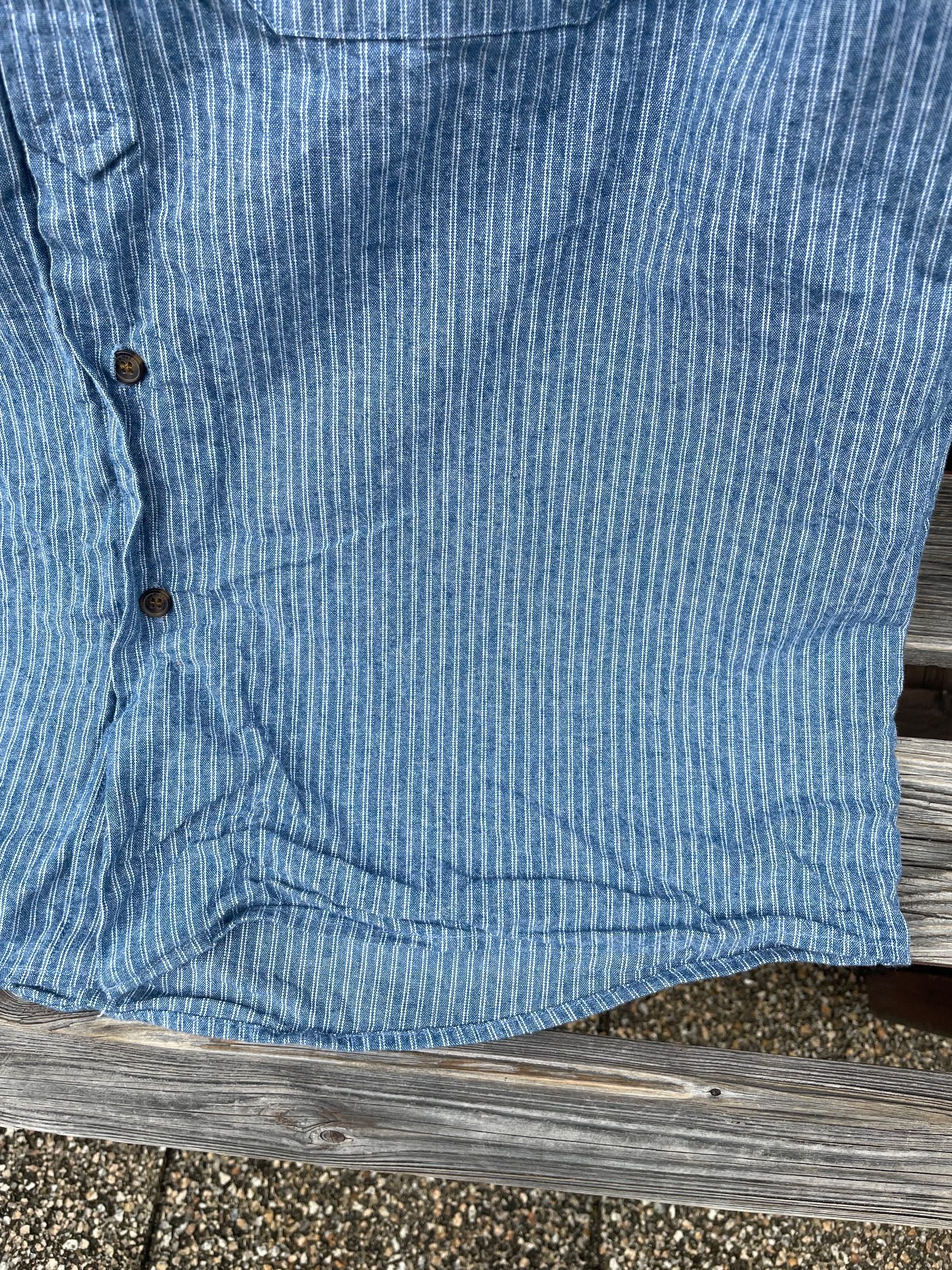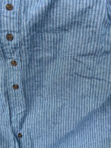 やや張りのある素材感で、色目もブルーシャンブレーの様な色目で合わせ易いかと思います!