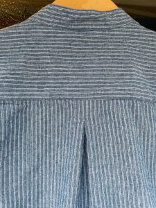 <バンドカラーにブルーベースのホワイトのピンストライプは、霜降り感があるのでブルーシャンブレーの様な雰囲気があります>