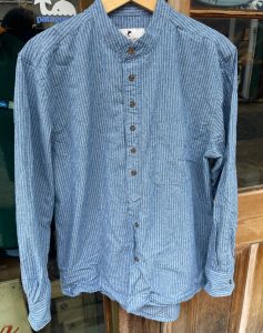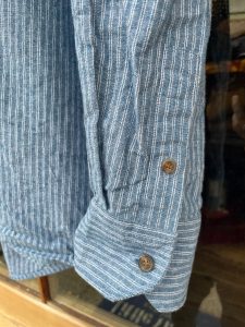 定番のGRANDFATHERSHIRTとの違いですが、襟元は同じスタンドカラーで、形がプルオーバーでは無く、フルオープン(前開き)となっており、着丈も長くないのが特徴的なシャツとなっています。