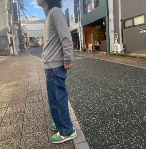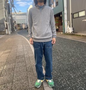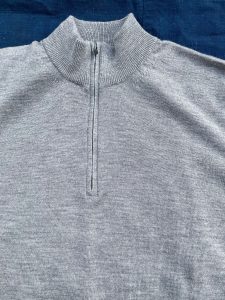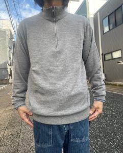 今回の特徴でもあるハーフジップは主張しすぎない上品な雰囲気で、襟の高さも高くいので、首元上まで上げれば、モックネックの様な雰囲気となり、着こなしのポイントになっています。