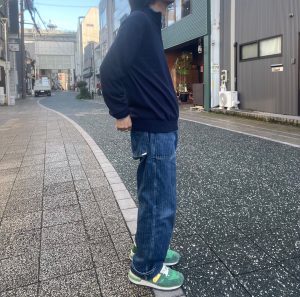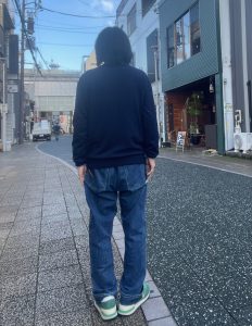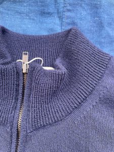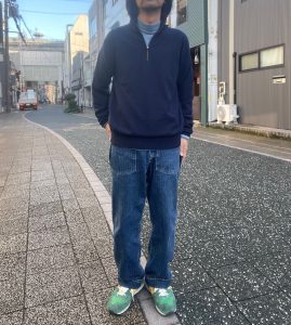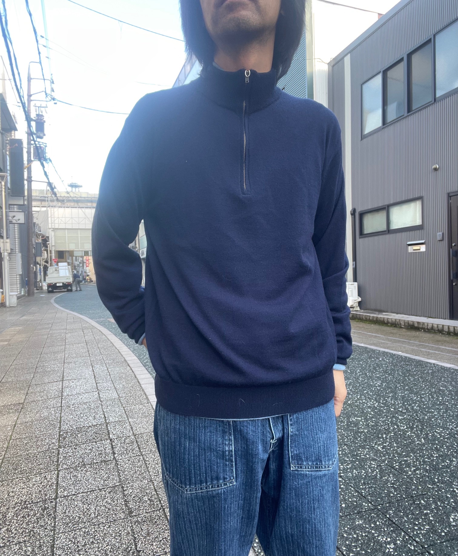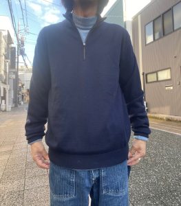 今回の特徴でもあるハーフジップは主張しすぎない上品な雰囲気で、襟の高さも高くいので、首元上まで上げれば、モックネックの様な雰囲気となり、着こなしのポイントになっています。