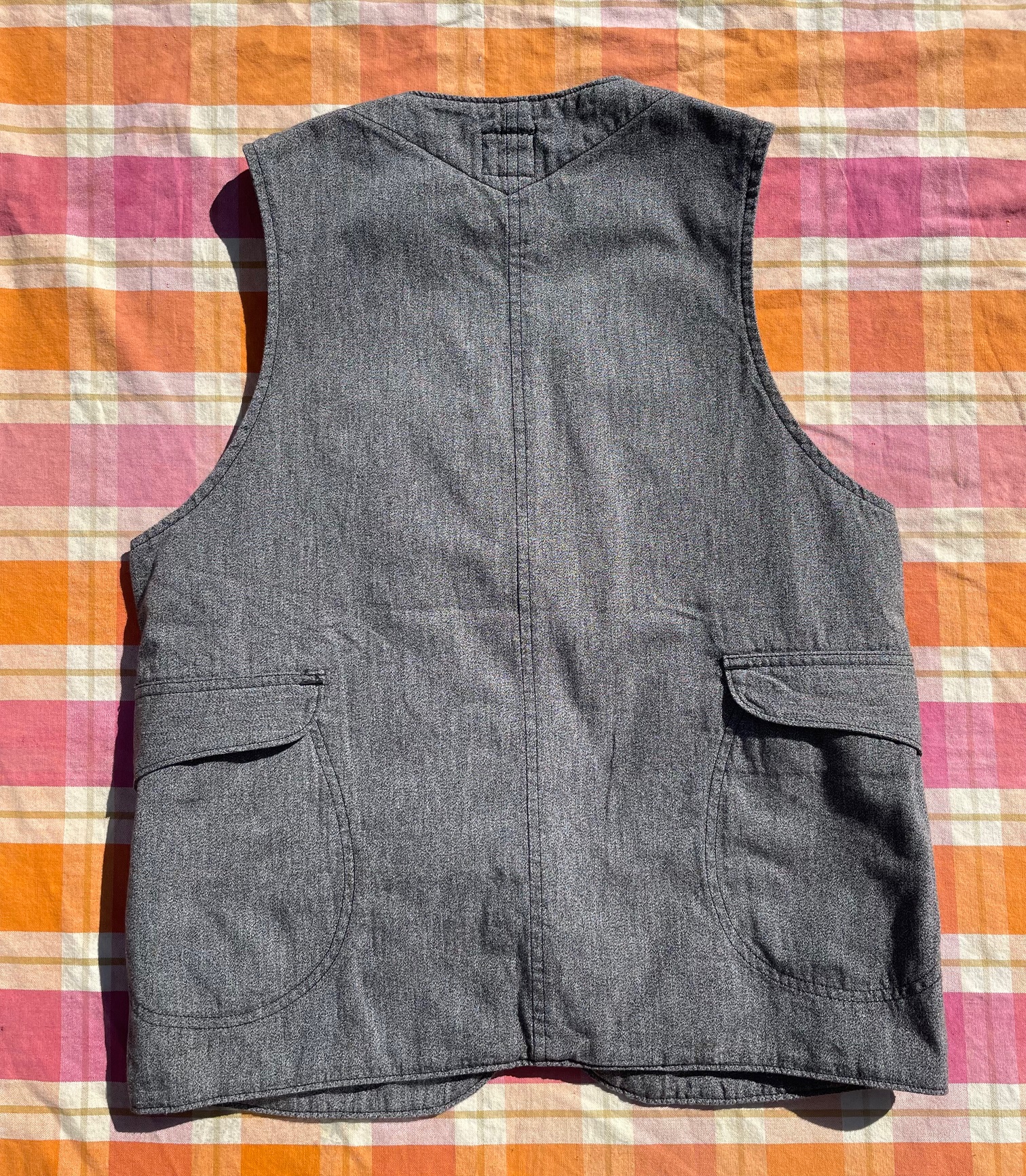 フロント両サイドに練りボタンが付いた収納力のあるポケット、サイドから背中まで回り込んだフラップ付きの下ポケット、また、フロント両サイドのゲームポケットの中にフラップ付きのポケットが付いた収納力抜群のベストです。