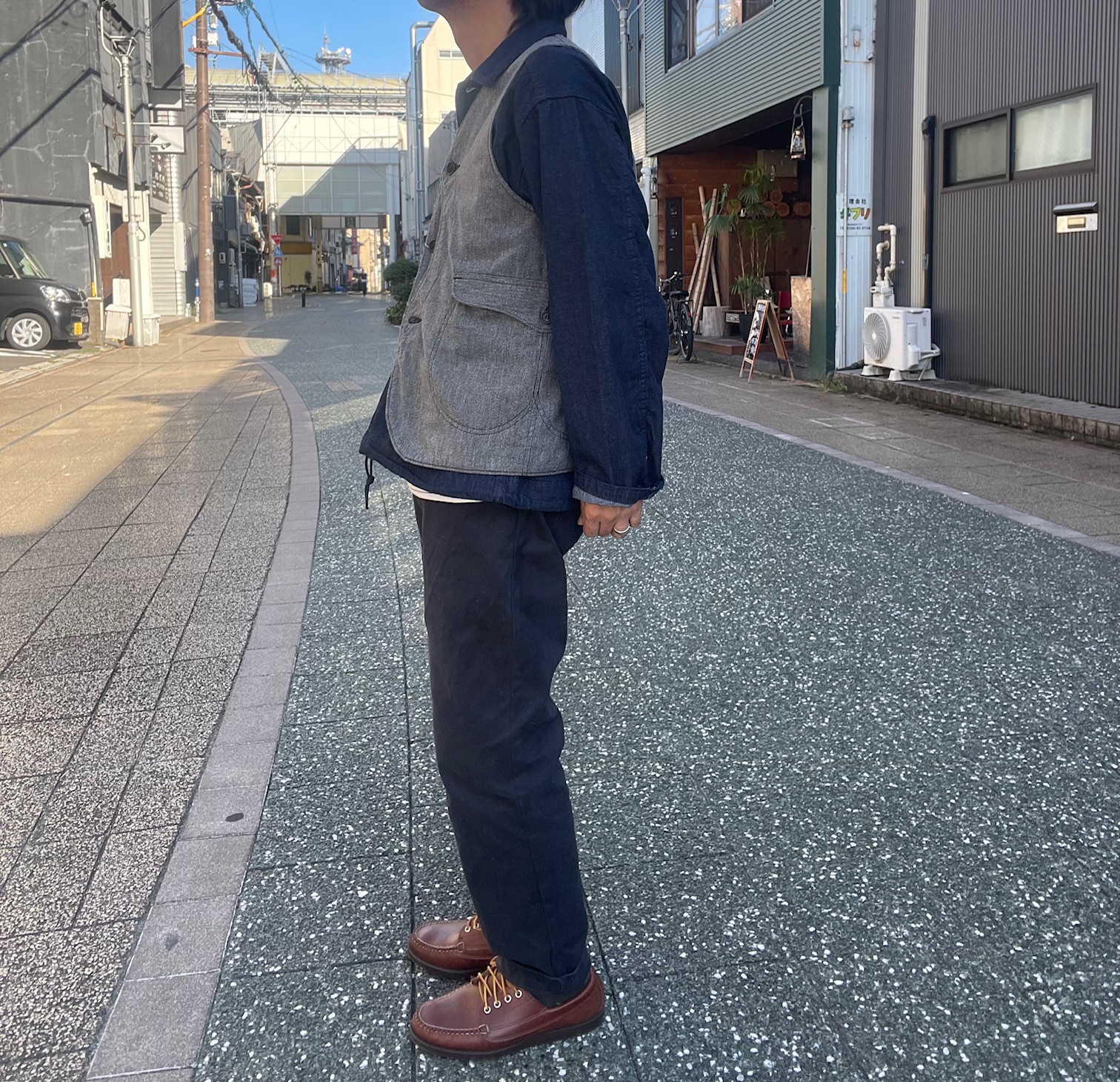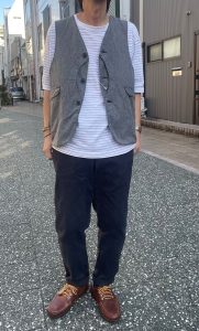 着丈が長めなので、カバーオールのインナーや上に羽織ったり、シャツやカットソーの上など、さまざまな着方が楽しむ事ができるベストです。
