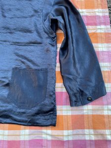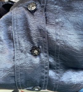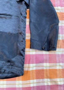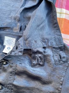 主なステッチのカラーは、ダークチャコールで、バータック、ボタンホールのステッチなどもチャコールとなっています。