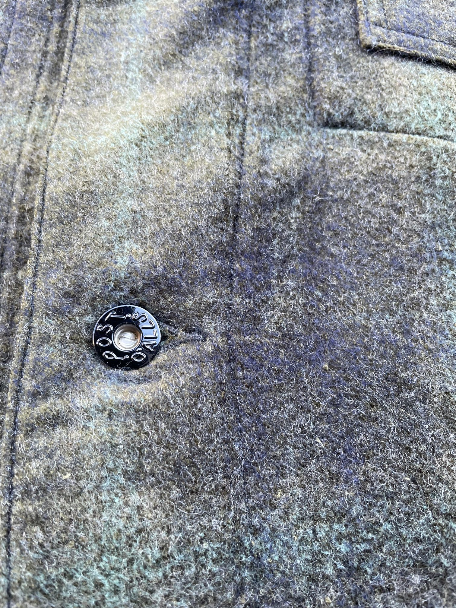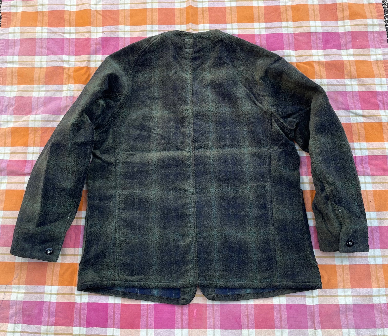 主な縫製はダブルステッチ、ラグランインスリーブ、黒ラッカーのドーナツボタン、袖口はサッパリとしています。
