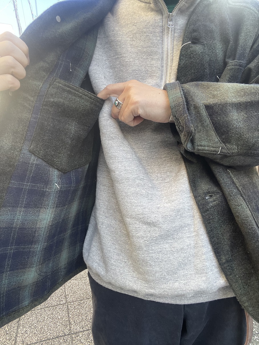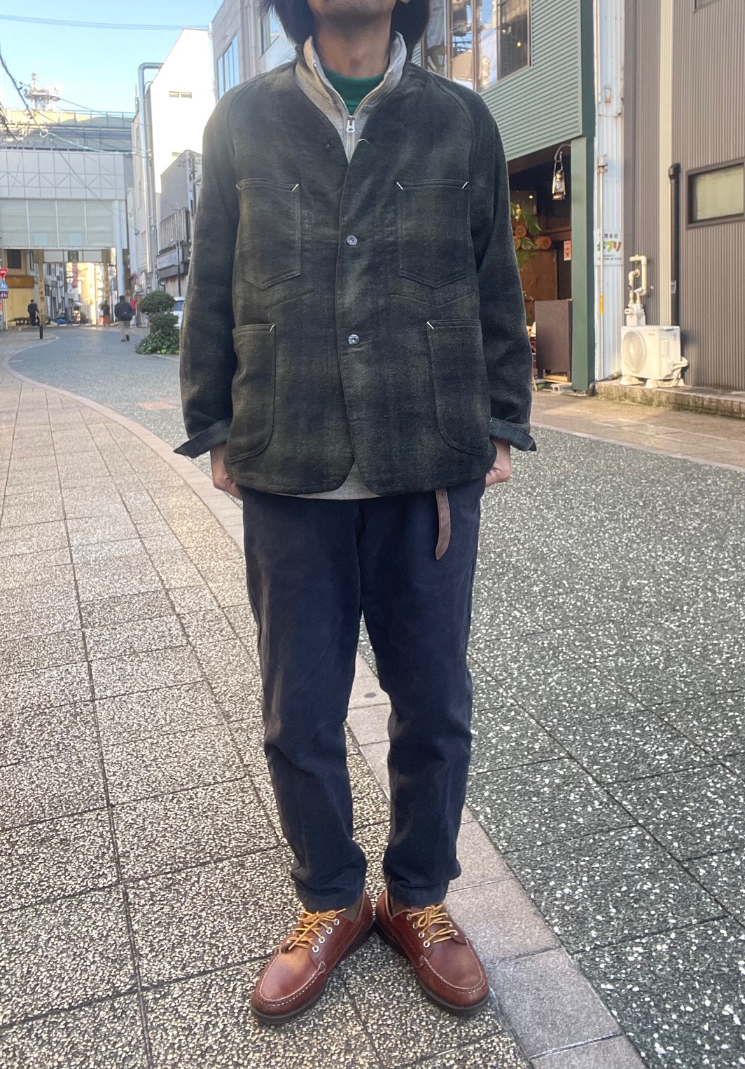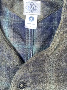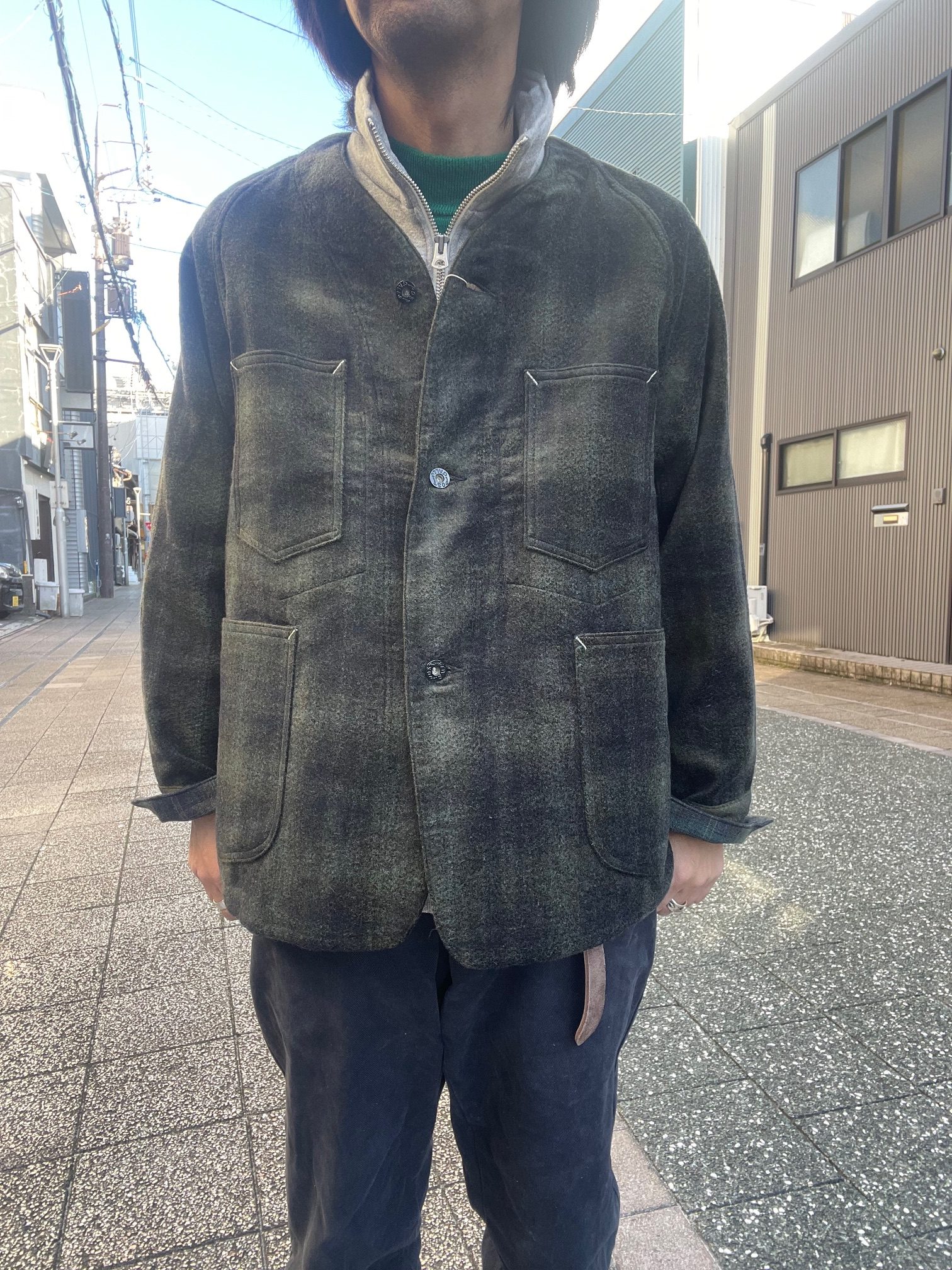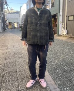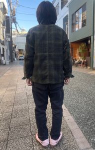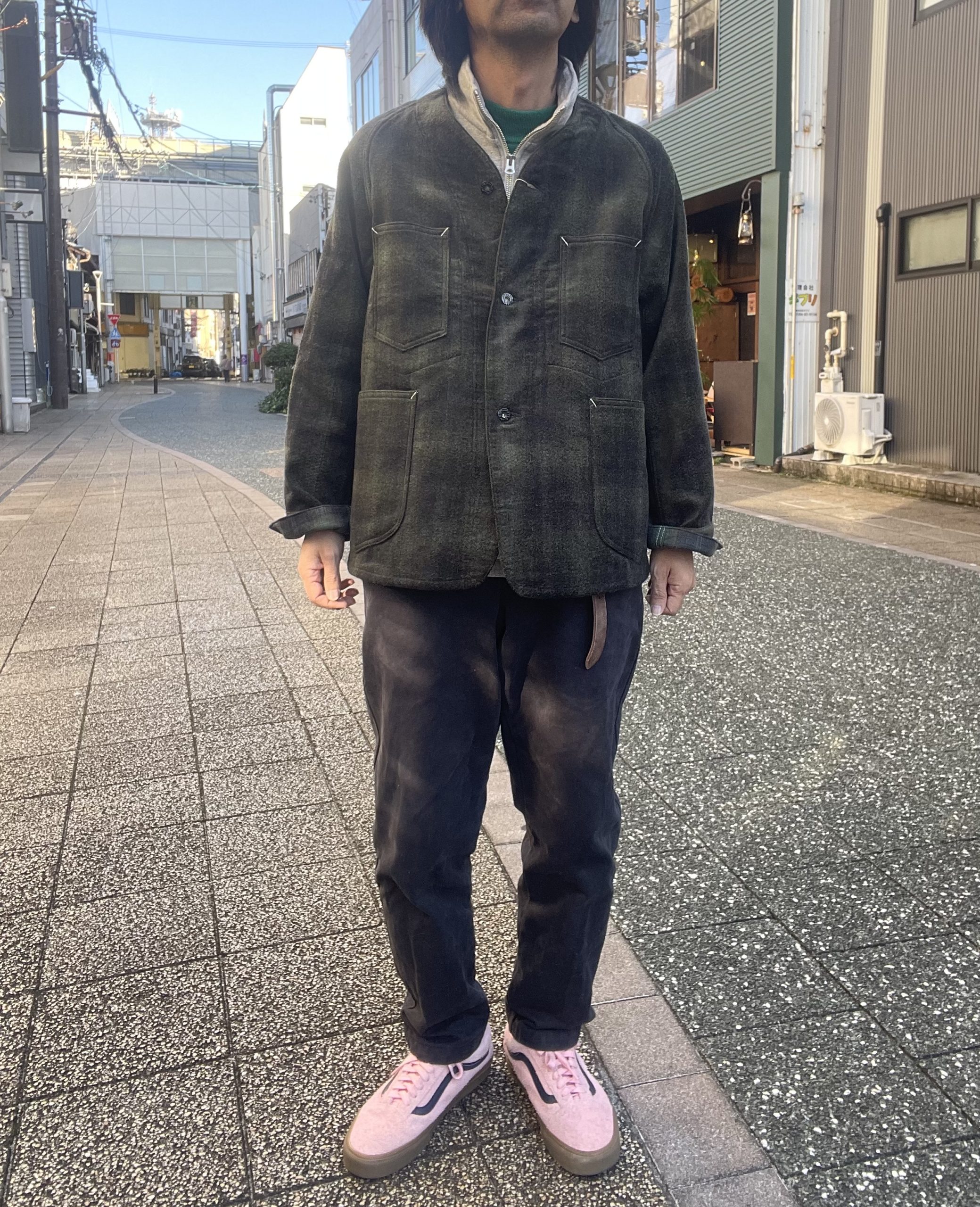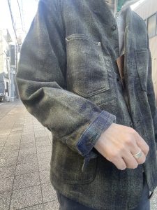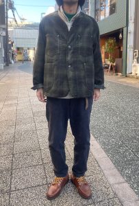 今回のジャケットは、襟が無く、着丈も短め、かつ生地もヘビーウェイトではない為、アウターとしては勿論、ジャケットのインナーにも合わせ易く、シャツ感覚で着る事も出来るので、ダウンベストなどの中綿系のベストとも相性良いかと思います。