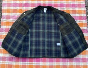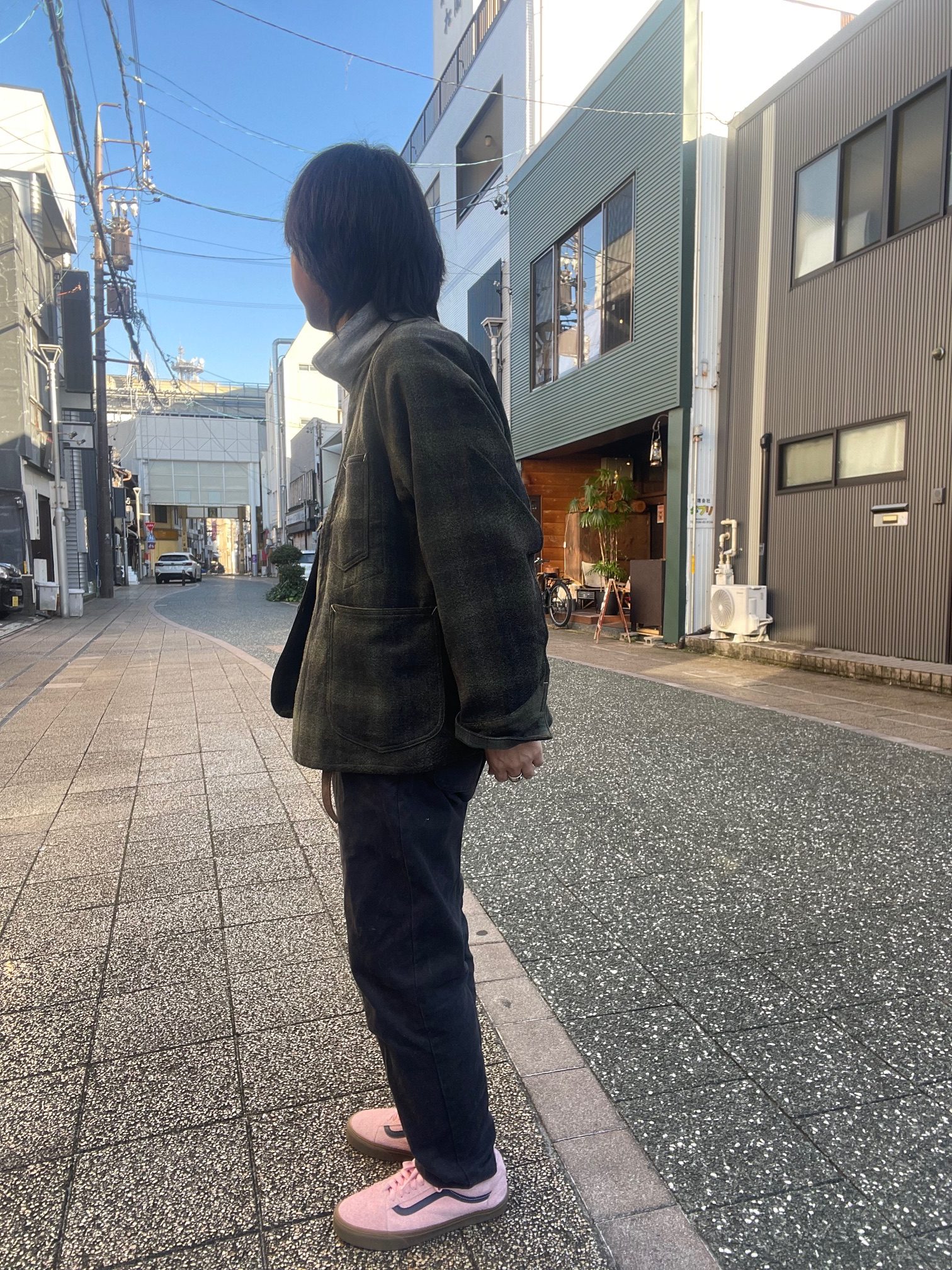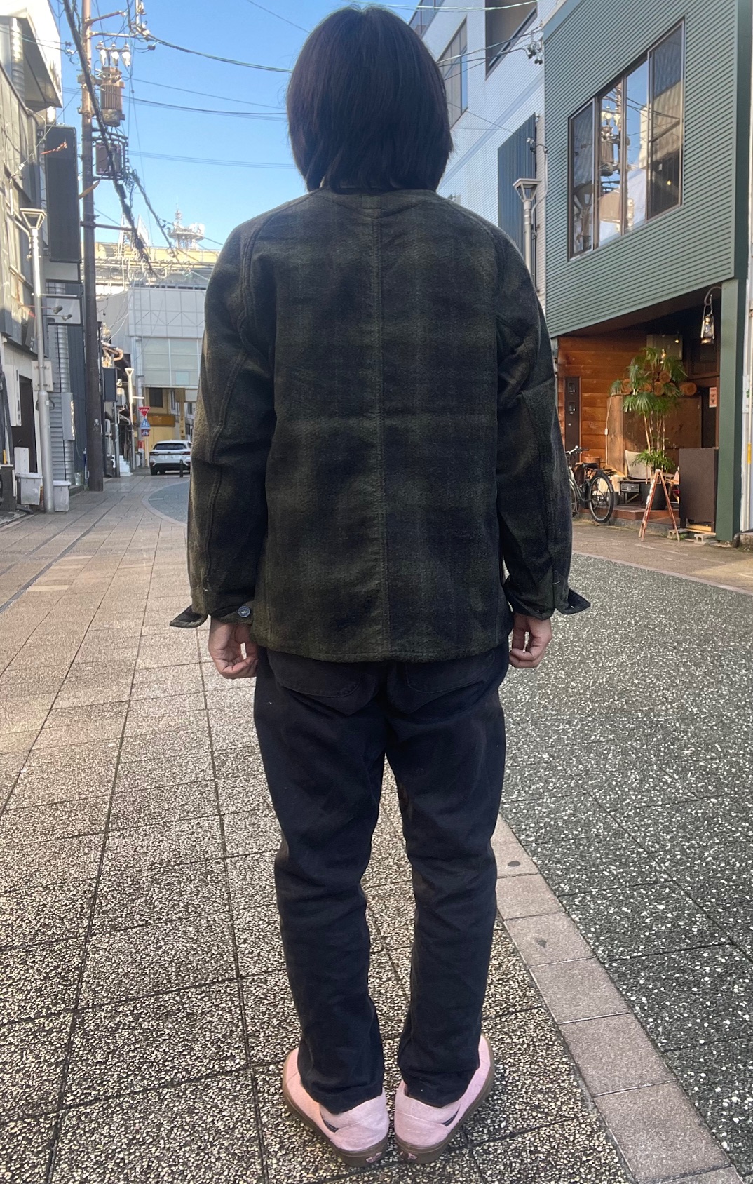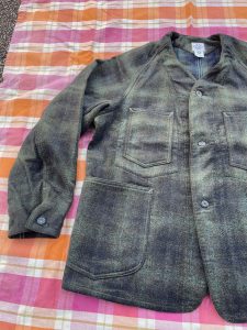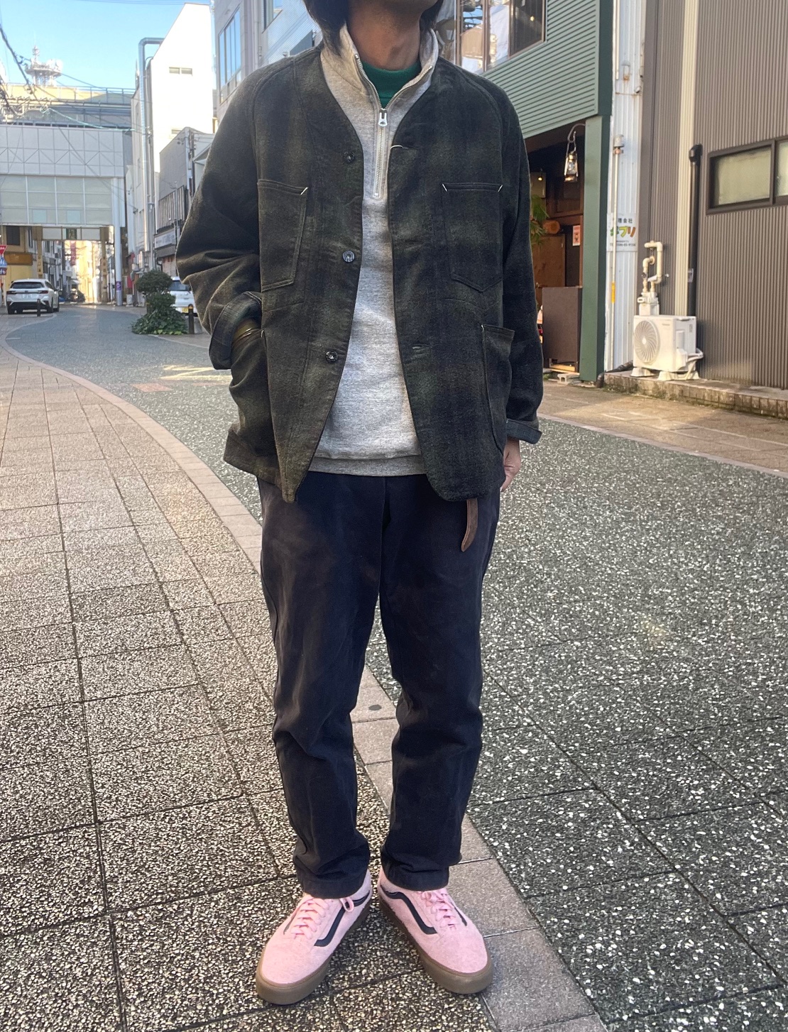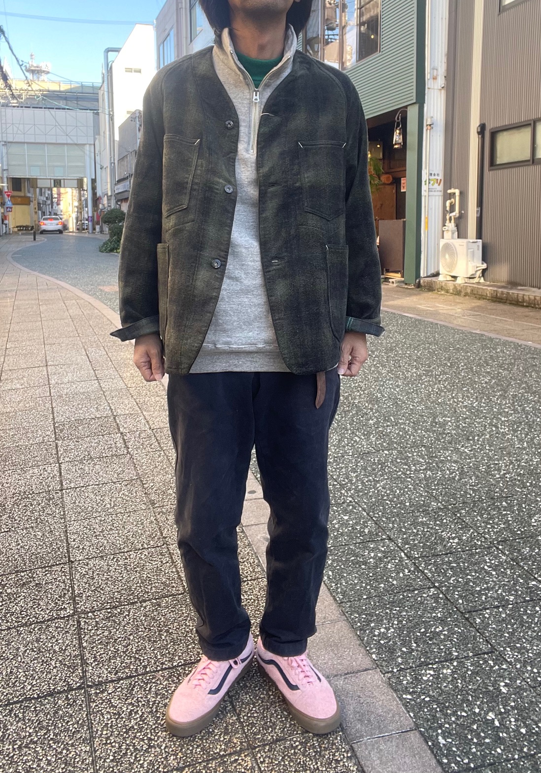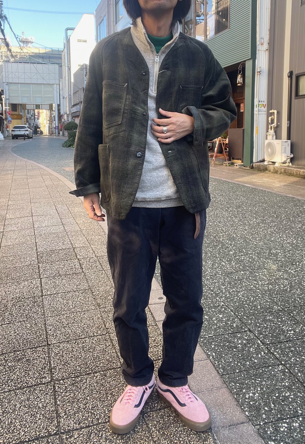 今回のジャケットは、襟が無く、着丈も短め、かつ生地もヘビーウェイトではない為、アウターとしては勿論、ジャケットのインナーにも合わせ易く、シャツ感覚で着る事も出来るので、ダウンベストなどの中綿系のベストとも相性良いかと思います。
