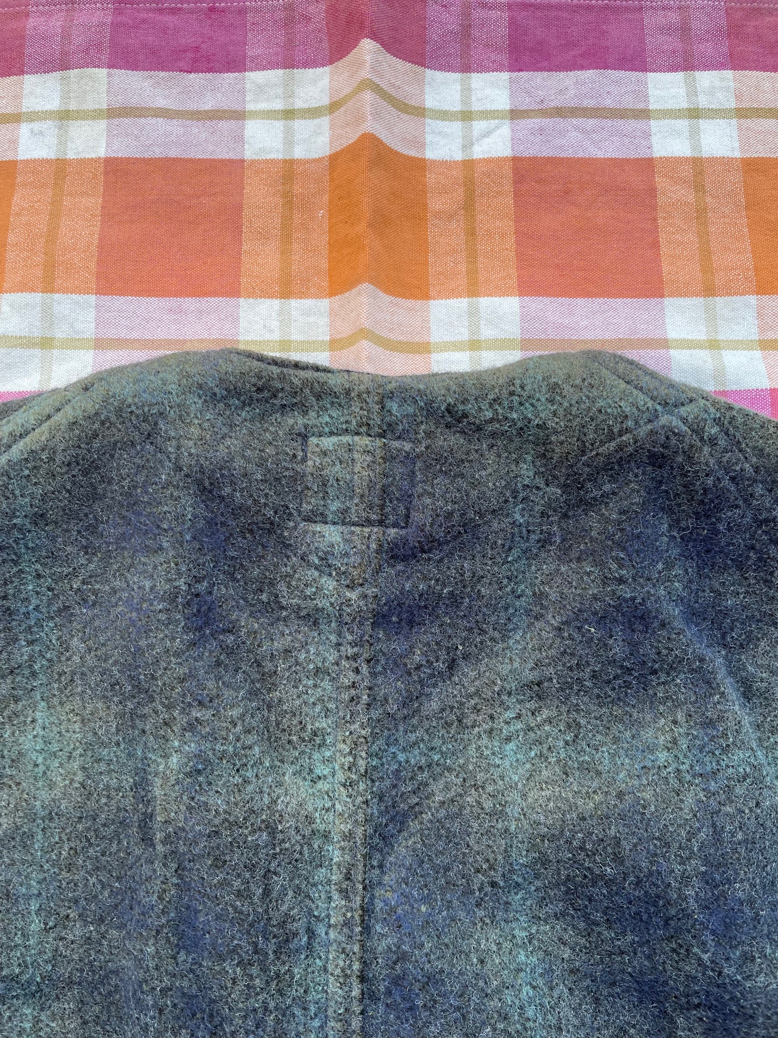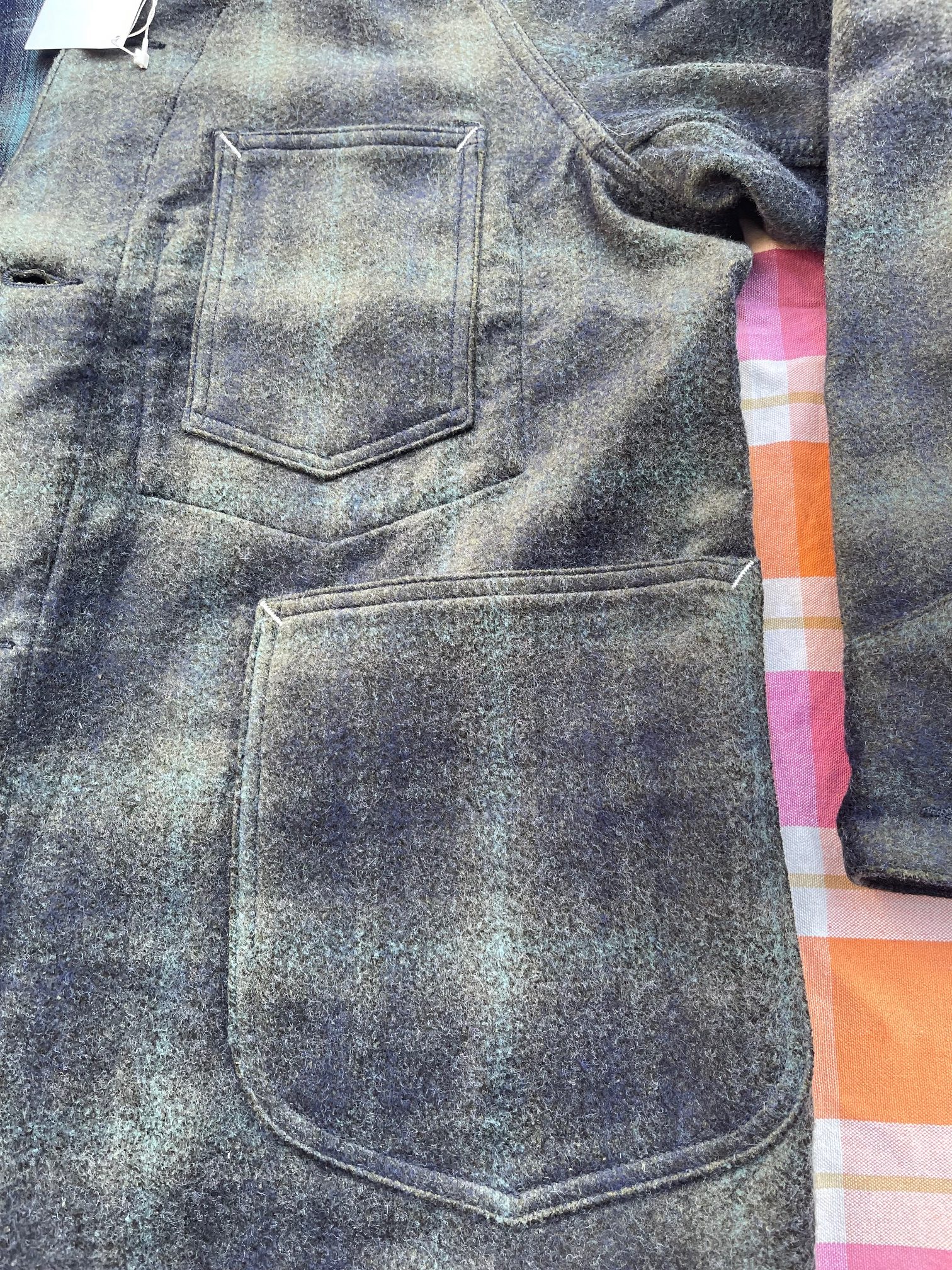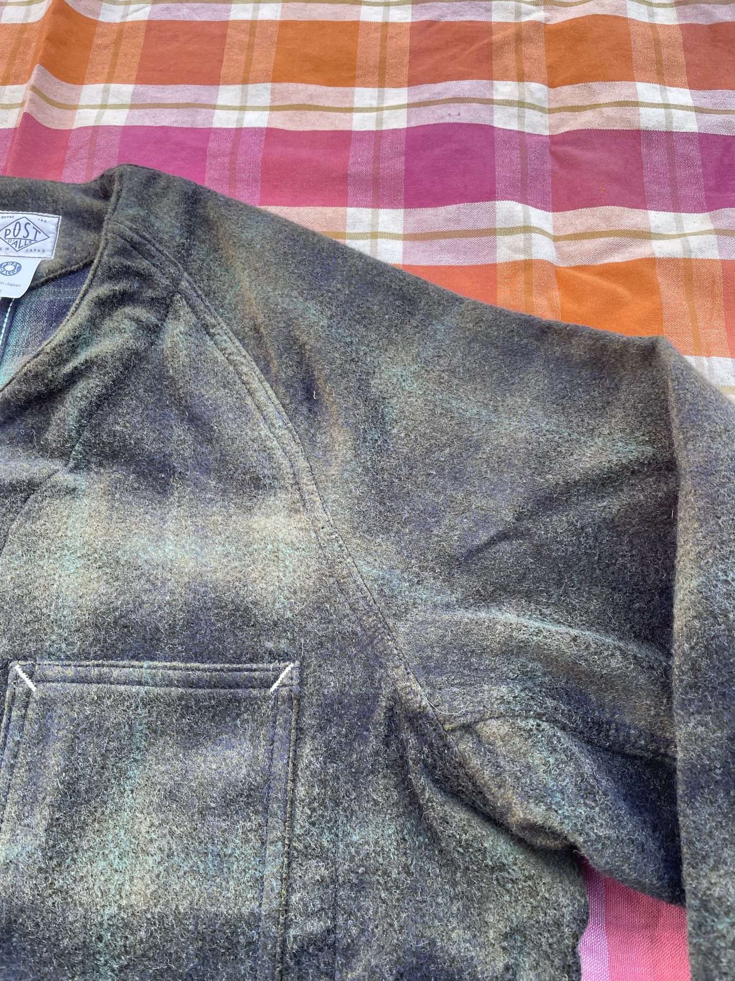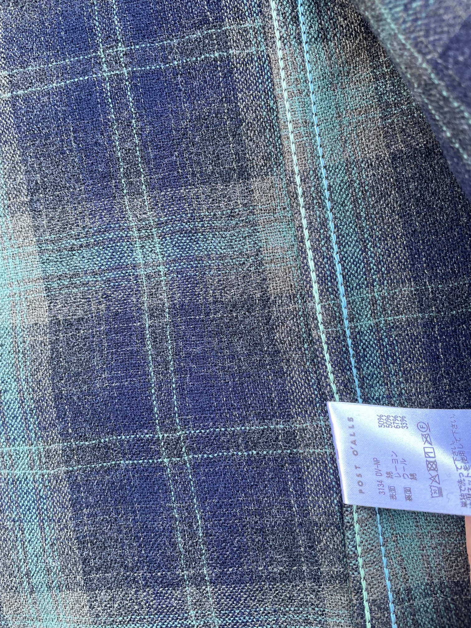 カラーは、深みのあるブラウンとグリーンチェックとなっておりますが、ニードルパンチ加工が施されているので、ぼやけた表情になっており、オンブレチェックの様な見た目となっています。