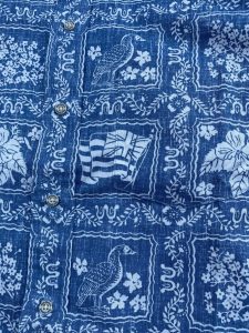 <ラハイナセーラー柄お馴染みのデザイン、ハワイ州旗、ハワイ州鳥、ハワイ州花、ハワイ州木がデザインされています>